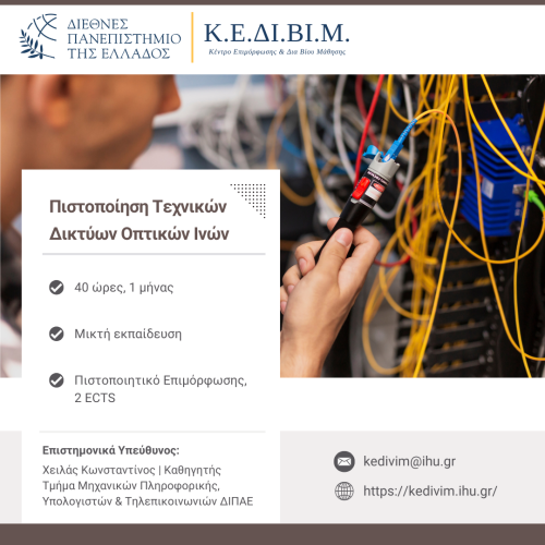 - Εσωτερικές και εξωτερικές εγκαταστάσεις οπτικών ινών (3 ώρες)