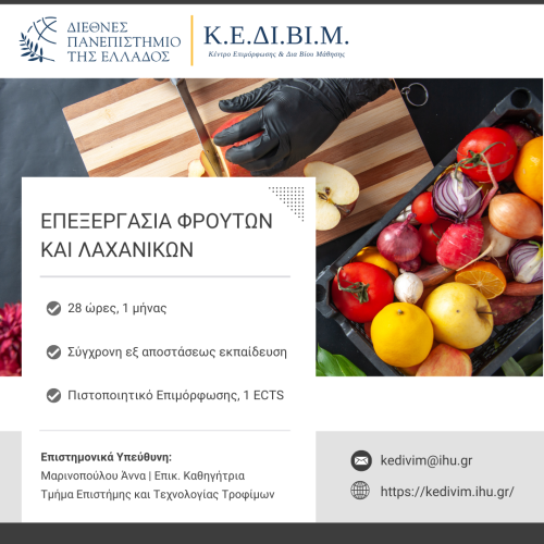 Το πρόγραμμα αποσκοπεί στην εξοικείωση των συμμετεχόντων με τα φυσικά και ποιοτικά χαρακτηριστικά των φρούτων και λαχανικών, εισάγοντάς τους στις βασικές μεθόδους επεξεργασίας τους. Στοχεύει επίσης στην ενίσχυση της γνώσης για τη διασφάλιση της ποιότητας και της ασφάλειας των νωπών φρούτων, λαχανικών και μεταποιημένων προϊόντων, και στην ανάπτυξη δεξιοτήτων σχετικών με τον αγροδιατροφικό τομέα. Οι συμμετέχοντες θα μελετήσουν τις διαδικασίες επεξεργασίας, όπως ζεμάτισμα, κατάψυξη και κονσερβοποίηση, καθώς και την παρασκευή προϊόντων όπως μαρμελάδες, τουρσιά, τοματοπολτοί και χυμοί, αξιολογώντας την ποιότητα και τη θρεπτική τους αξία.
